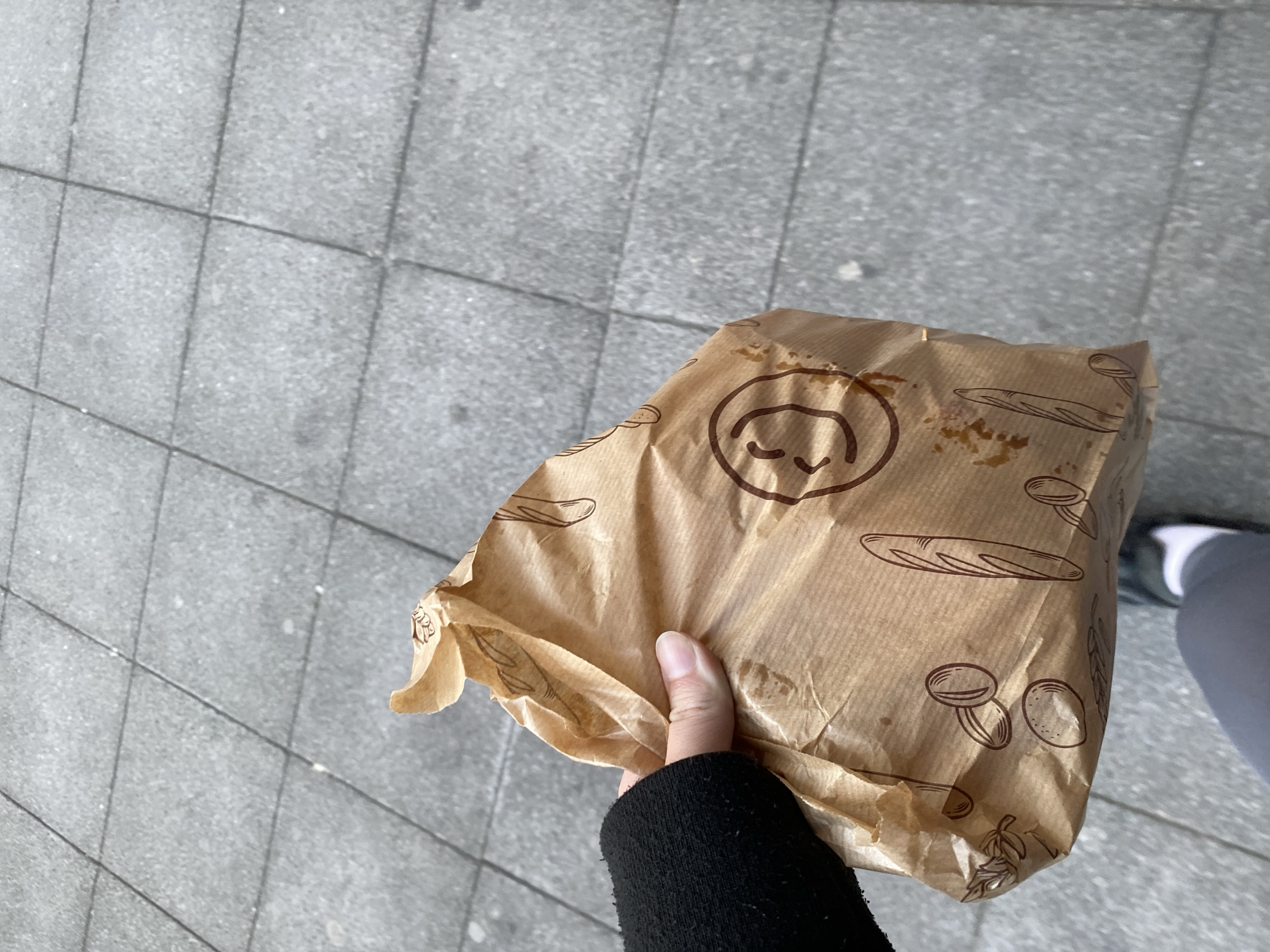A first-person, downward-angled shot captures a person holding a crumpled light brown paper bag