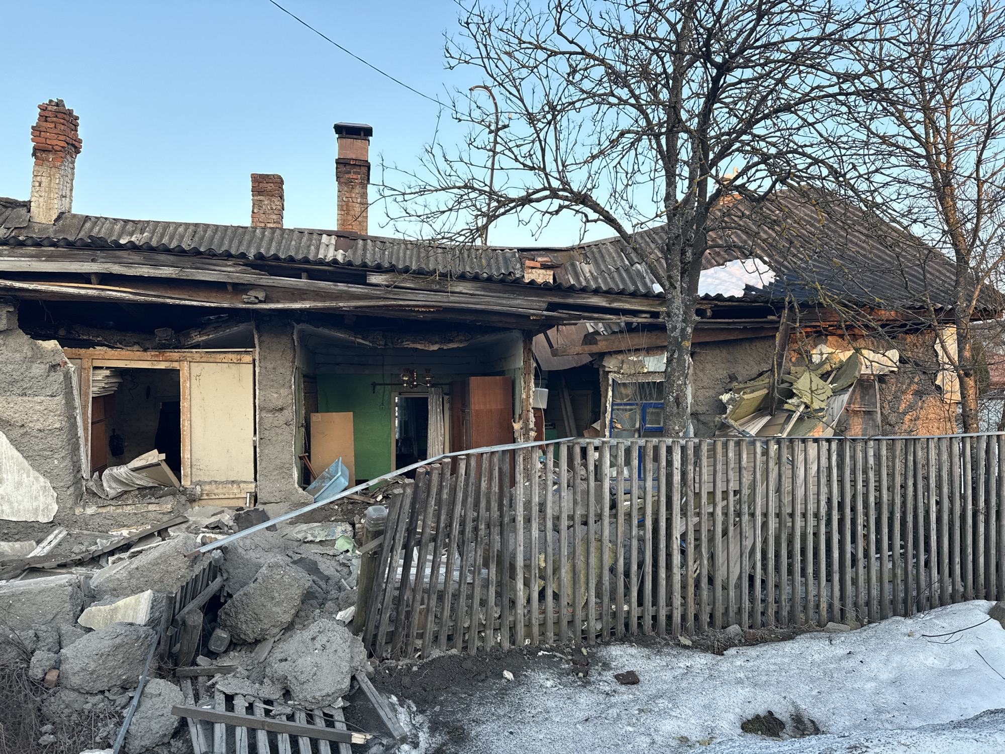 This image displays a severely damaged, single-story residential structure located in Rybinsk, Russia. The building's front facade exhibits extensive structural degradation, with sections of concrete or stucco walls crumbled and interior spaces exposed. The dark gray corrugated roof is significantly compromised, showing multiple large holes, exposed timbers, and sagging sections. Three brick chimneys rise from the roofline; two are in a state of decay, while the third on the far right is more intact and capped. Piles of concrete rubble, fragmented wood, and other building debris are strewn across the ground directly in front of the structure. A weathered, grey wooden picket fence with numerous missing or broken vertical slats extends horizontally across the mid-ground, separating the immediate foreground from the main building. Visible through the fence and openings are various elements: a large entry point on the left revealing a green interior wall, a light-colored door slightly ajar, a darker wooden door further within the structure, and a broken window frame with blue trim on the right. Internal clutter, including a light fixture, is visible through the exposed openings. The immediate foreground consists of melting snow patches interspersed with dark earth and mud. Several bare deciduous trees with intricate branch networks are visible on the right side of the image and behind the building, silhouetted against a clear, light blue sky. A small white bird, likely a pigeon, is perched on the peak of the roof towards the right side. No individuals or active subjects are present in the scene.