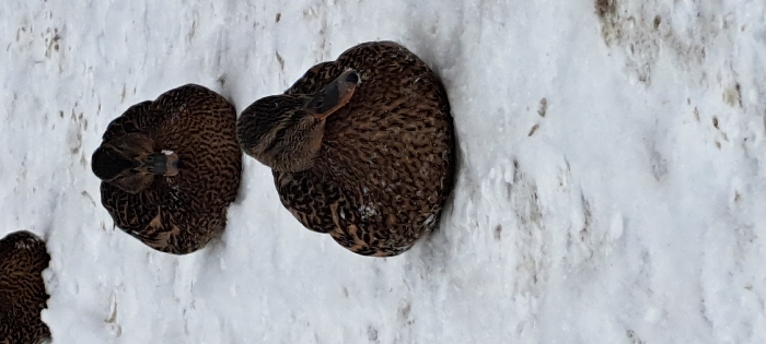 - "Three mottled brown and black ducks are resting on snow-covered ground in Novoe Devyatkino, Russia" by FM-FrnGi2, licensed under CC BY 4.0
