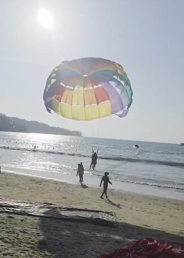 On a sunny day at a beach, a colorful parasail with two people attached rises from the sandy shore and floats over the ocean