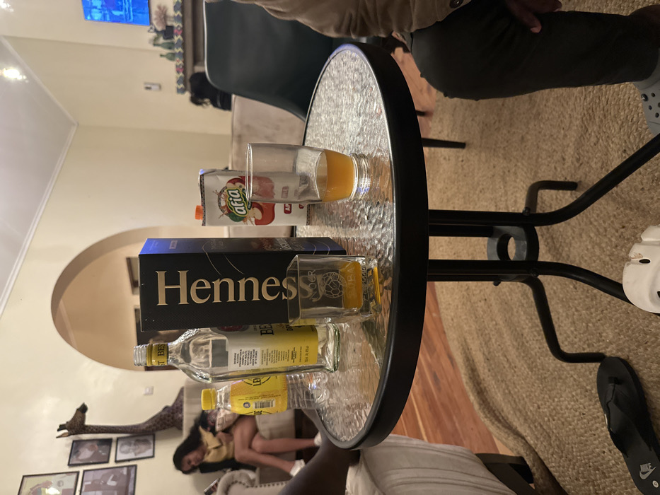 This image depicts an indoor residential scene, presumed to be within Olkaria ward, Kenya. The foreground is occupied by a round table with a black metal frame and a textured glass top. On the table, from left to right, are a clear plastic bottle of "BEST" branded lemonade, a largely empty clear glass bottle of "BEST DRY GIN 10 YEARS", a dark rectangular "Hennessy" box, a square glass containing a small amount of amber liquid and etched with "NOOR CUBA", a white "Afia" apple juice carton with a red cap, and a tall clear glass holding amber liquid, approximately one-third full. Two individuals are partially visible in the immediate foreground, seated. On the left, a person's leg is visible, with a black Nike flip-flop resting on a round woven rug. On the right, a person's lower torso and leg are visible, wearing dark trousers and a grey Croc shoe. In the mid-ground left, a female individual with long dark hair, wearing a yellow top and light-colored shorts, is seated on a light-colored sofa, looking downwards with her legs crossed. The room features light-colored walls, a wooden floor partially covered by a large circular woven rug, and light-colored sofas. A tall wooden giraffe statue stands against the back wall, which is adorned with several framed pictures. An arched doorway leads to an adjacent room. In the far background right, a wall-mounted television with a blue display is visible above a decorated mantelpiece. The scene is illuminated by dim, artificial indoor lighting, suggesting an evening or nighttime setting.