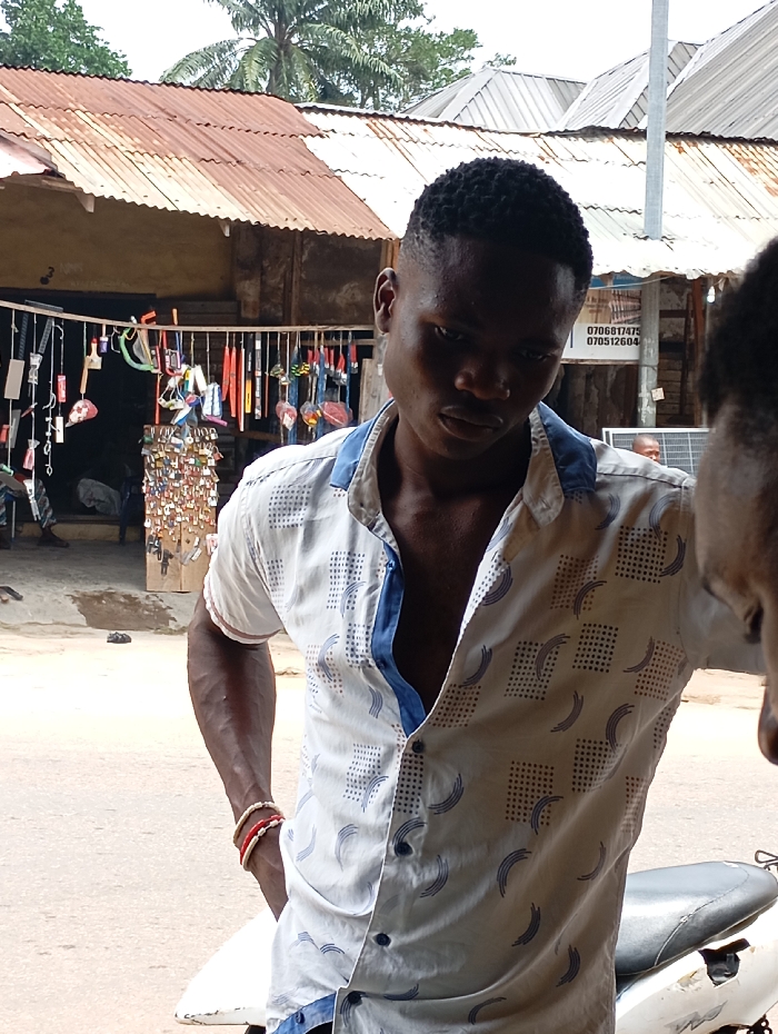 The image captures an outdoor street scene in the city of Unknown, Unknown. A young adult male, of dark complexion and with short, textured dark hair, is positioned slightly left of center in the foreground. He wears a light-colored, short-sleeved collared shirt adorned with blue geometric and curved patterns, unbuttoned to reveal a blue inner layer. Two bracelets, one white and one red, are present on his right wrist, where prominent veins are visible. His gaze is directed downwards and towards the right, engaging with a partially visible second individual, of whom only the right side of the head and face are visible on the far right edge of the frame. The main subject's right hand rests near his hip, adjacent to the white front body and black seat of a scooter or motorcycle, visible in the lower right quadrant. The background consists of a street with structures featuring corrugated metal roofs. The building on the left exhibits a rusted roof and functions as a retail space, displaying various items such as paintbrushes, tools, and keys hanging from a wooden beam, along with a stand of numerous padlock-like objects. A person is partially visible within the entrance of this building. To the right, a light pole with attached white signs displaying phone numbers (0706871475, 070512604) stands in front of another building, where the head of a third individual is discernible further down the street. Green foliage and palm trees are visible above the rooftops. The ground is a light-colored, irregular surface, consistent with an unpaved or worn road. The scene is illuminated by natural daylight.
