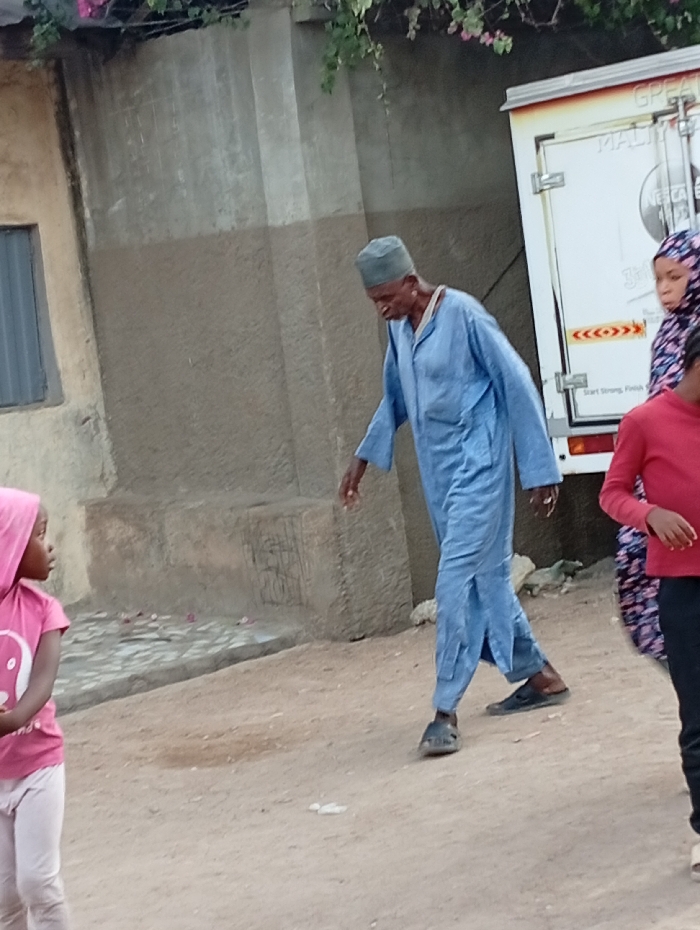 The image depicts an outdoor scene in Gwagwarwa, Nigeria, under daylight conditions. An adult male of apparent advanced age, dressed in a light blue traditional tunic and cap, walks from left to right on an unpaved dirt path. He wears dark sandals and has a white stud visible in his left ear. In the lower-left foreground, a young girl in a pink hooded top with a white graphic and light-colored trousers stands, facing right and observing. To the right of the walking man, a female figure in a patterned head covering and garment is partially visible behind another child in a red long-sleeved top, positioned in the immediate right foreground. In the background, a white cargo truck with a visible rear door, branded with "GREAT MAL...", "NESCAFE 3in1", and "Start Strong, Finish" text, and featuring red and white chevron hazard markings, is partially visible. Behind the individuals, multi-toned concrete buildings, including one with a dark rectangular window on the left, are present. Green foliage with pink blossoms overhangs the upper-left portion of the frame. The ground is an unpaved, light brown earth surface, scattered with small white debris.