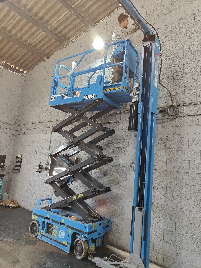 - "An interior scene in Kiryat Ata, Israel, depicts a male individual operating a blue Snorkel 1930SE electric scissor lift inside a workshop or industrial building" by FM-zE0mP2, licensed under CC BY 4.0
