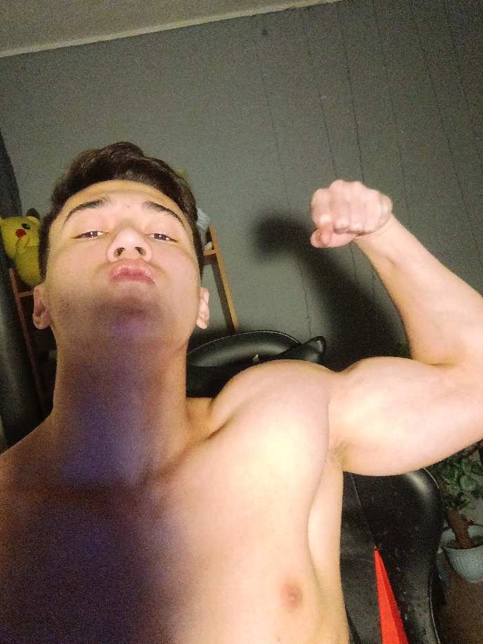 A shirtless man poses, flexing his right arm. He has dark hair and is looking at the camera with pursed lips. In the background, there is a chair, a wooden shelf unit with a Pikachu plush toy, a plant, and a grey wall. The lighting is dim, with shadows covering part of his chest.