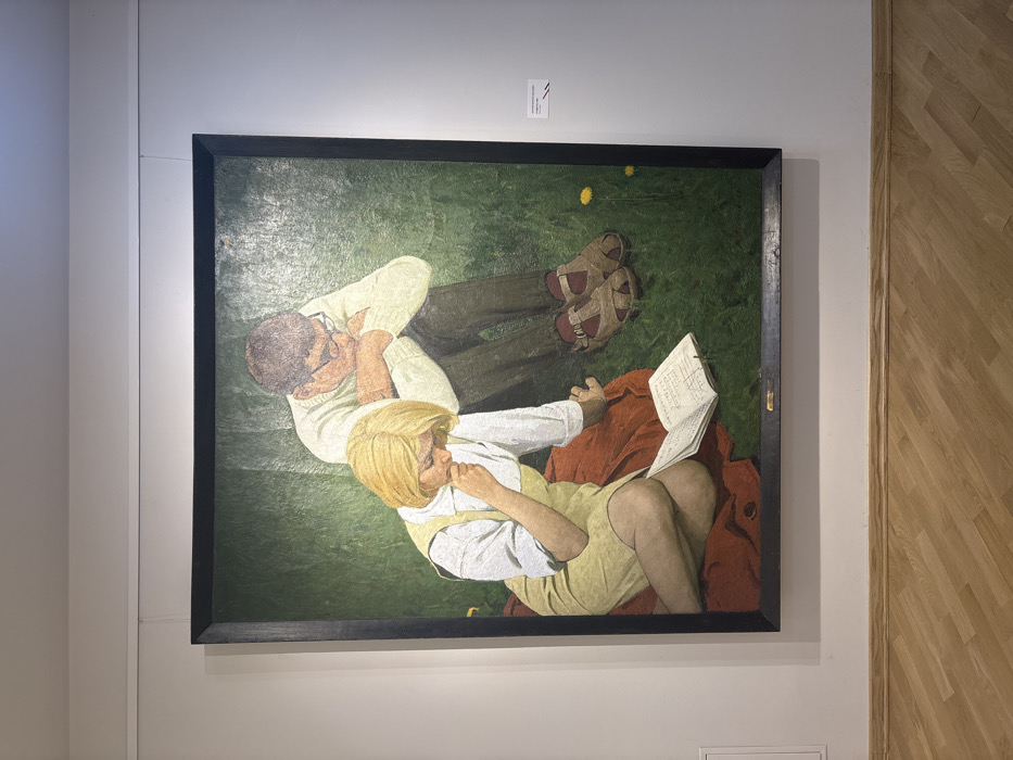 This image captures a large framed oil painting, titled "Youth" (Юность), exhibited on a white wall within an art gallery in Voronezh, Russia. The painting depicts two young individuals seated on green grass, accented with a few yellow flowers. A blonde female, positioned in the foreground to the left, wears a white long-sleeved shirt and a light yellow pinafore dress. She sits with her legs crossed, partially covered by a reddish-brown blanket, intently reading an open book that displays both text and musical notation. Her right hand is raised to her chin in a reflective gesture. Behind and to the right of her, a male figure with short brown hair and glasses is seated, dressed in a light-colored long-sleeved sweater, dark trousers, and open-toed sandals worn over reddish socks. He leans forward, resting his elbows on his knees with hands clasped, also looking downwards. The painting is enclosed in a dark, thick wooden frame. The gallery wall is white and unadorned, save for a small white informational placard to the right of the artwork. The floor is light-toned wooden parquet, laid in a diagonal pattern. The scene is evenly lit by overhead artificial lighting.