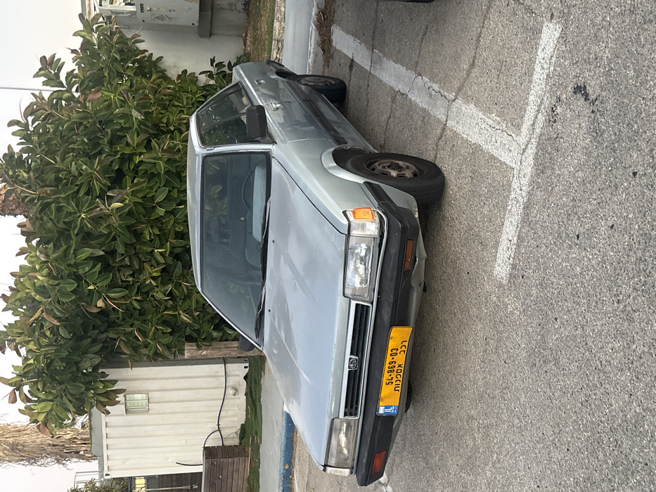 The image displays a light blue/silver four-door Subaru sedan, an older model, parked in a paved lot in Mazkeret Batya, Israel