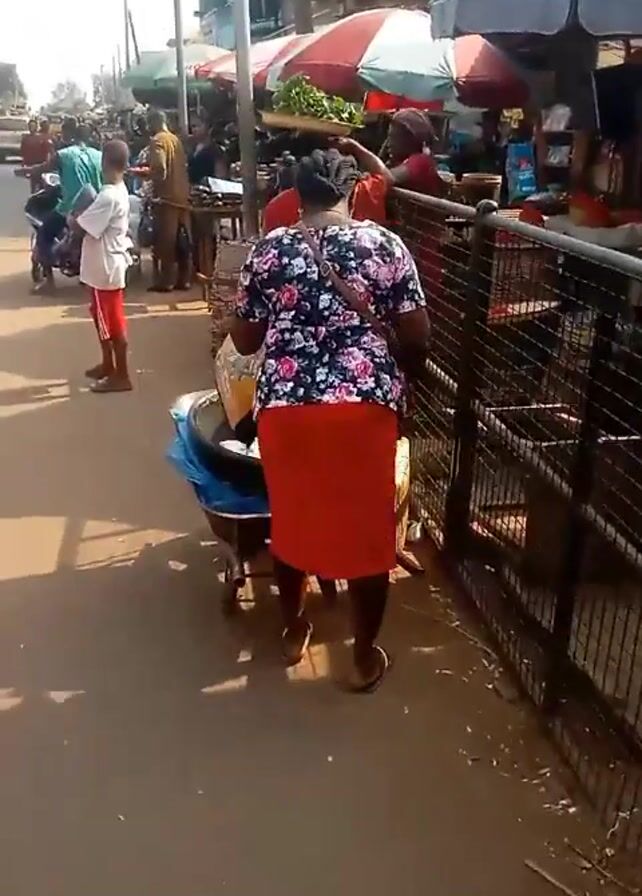 bustling street market scene in an urban area. People are walking around, some are carrying goods on their heads or in containers. There are various vendors with stalls set up under umbrellas, selling food and other items. A woman in a red skirt and floral top is seen near a large basin. Another woman in an orange dress is carrying a platter of greens on her head. A man on a motorcycle is navigating through the crowd. The street is lined with buildings, and the overall atmosphere is lively and busy.
