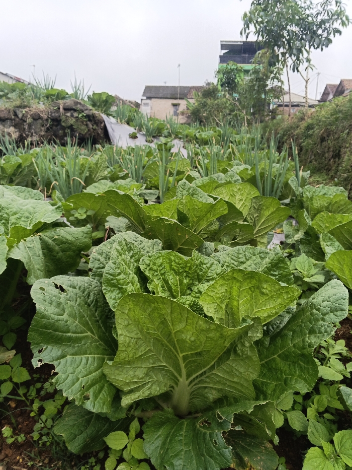 A low-angle, eye-level photograph captures a cultivated agricultural field in Makilala, Philippines, under an overcast sky. The immediate foreground features multiple large-leafed green vegetables, consistent with Napa cabbage, exhibiting some minor insect damage (holes) on their leaves, growing from dark soil. Beyond these, rows of slender, upright green plants, identified as green onions or scallions, extend into the midground, with dark plastic mulch sheeting visible between rows. In the left background, an elevated earthen bank partially covered by sparse vegetation and a dark sheet is present. The central and right background reveals several structures: a light-colored, single-story building with a light roof, and a taller, multi-story building with a distinct green lower section and dark upper levels, partially obscured by trees. Additional residential structures and dense foliage are visible further right. No individuals are present in the scene. The ambient light is diffused, characteristic of an overcast day.