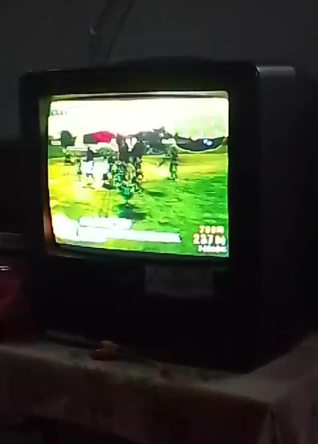 A close-up shot shows a small, old, black television set displaying a video game with figures in green