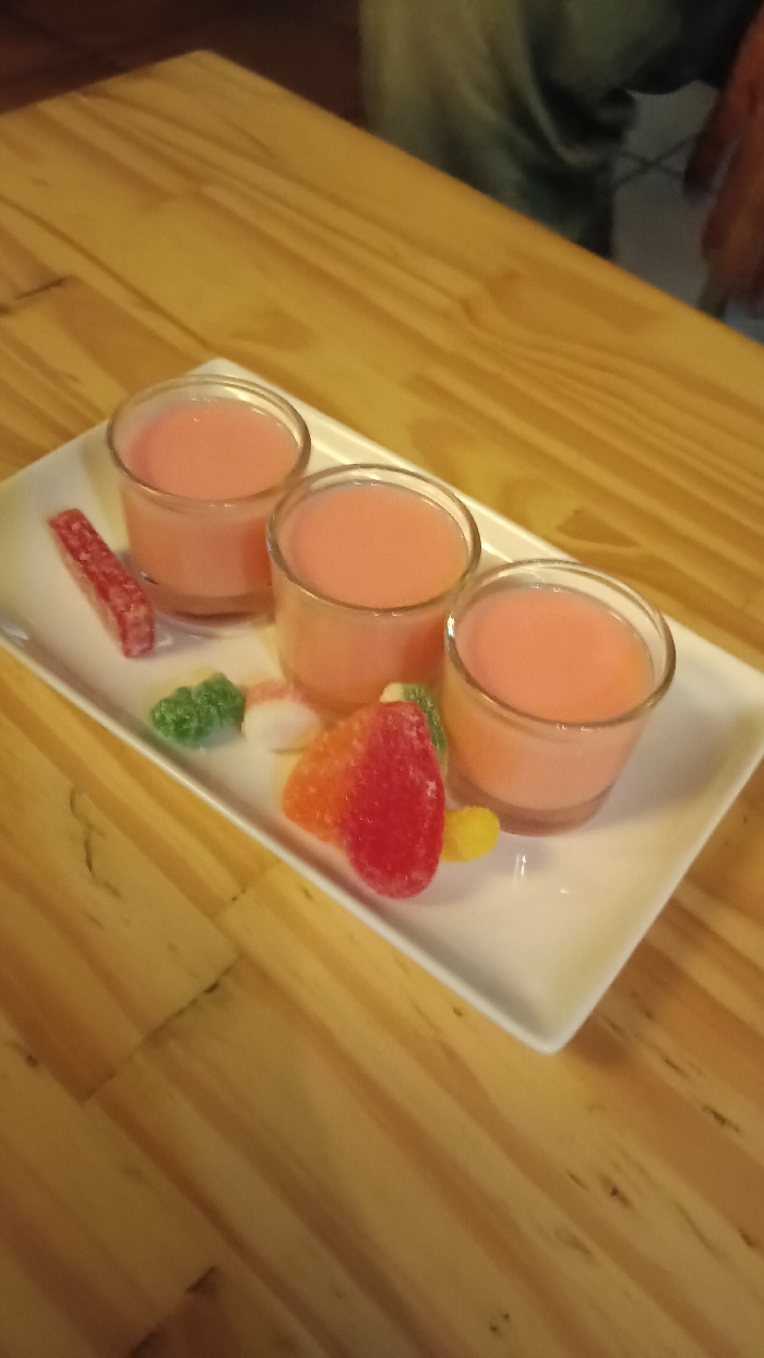 Three glasses filled with a pink liquid sit on a white rectangular plate. Beside the glasses are several pieces of candy, including a red stick, a green gumdrop, a heart-shaped gummy with orange and red sections, and a yellow gumdrop. The plate is placed on a wooden surface, with the top portion of a person visible in the background.