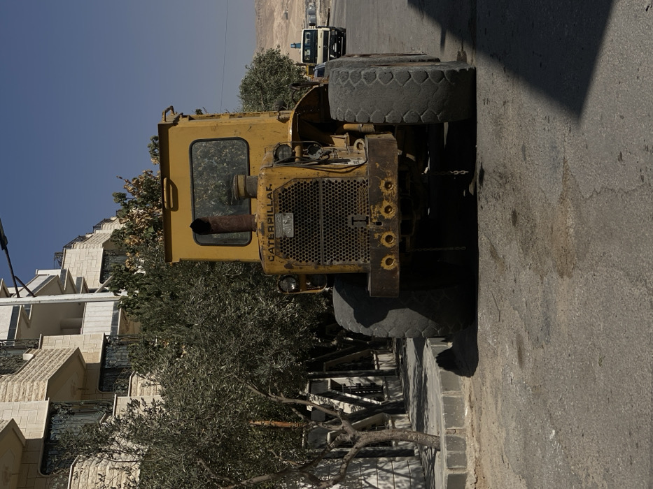 - "The image depicts a weathered yellow Caterpillar heavy equipment vehicle, likely a front-end loader, parked on an asphalt street in At-Tall, Syria, under a clear blue sky" by FM-KX5IH3, licensed under CC BY 4.0