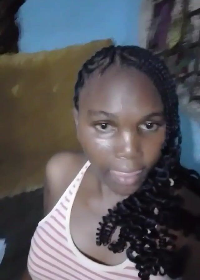 A medium shot shows a dark-skinned woman with black braided hair wearing a white and pink striped tank top