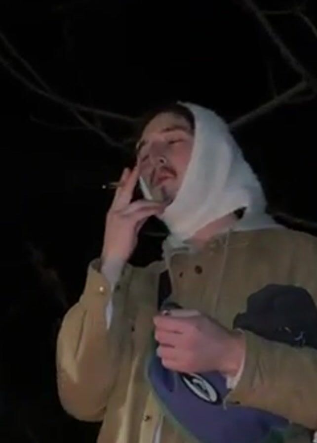 A man in a tan jacket and black-and-white pants stands with a white, fluffy head covering while smoking. He is outside at night with trees in the background and other people nearby. He brings his hand to his face after taking a drag from his cigarette.