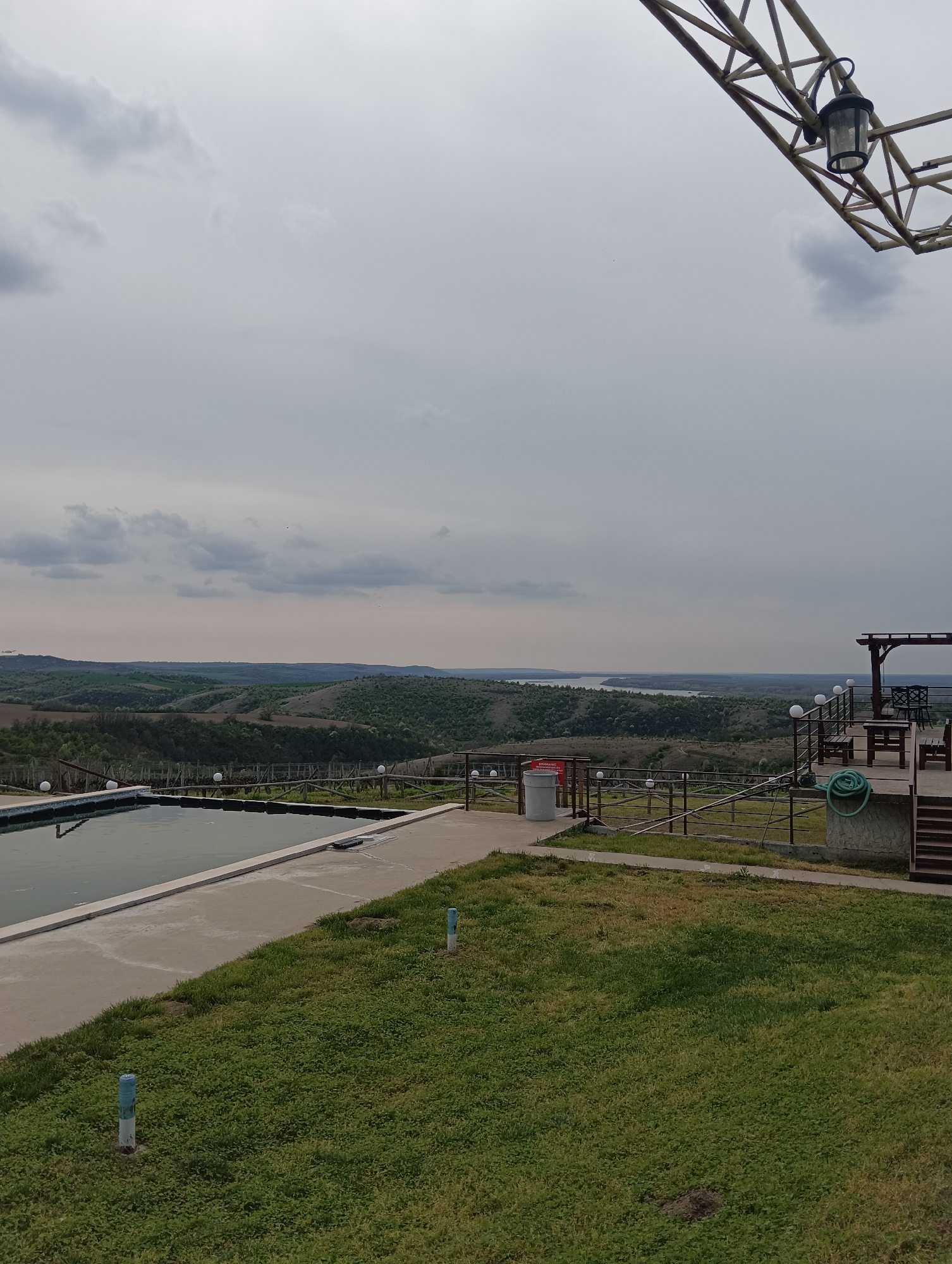 A panoramic landscape scene, likely from a high vantage point in Mechka, Bulgaria, features a muted color palette under an overcast sky. In the foreground, a rectangular, concrete-edged swimming pool filled with dark water reflects the ambient light. Adjacent to the pool is a green grassy area, partially overgrown. Small, blue and white vertical posts protrude from the lawn. A metal and wood fence separates the immediate foreground from a vista featuring rolling hills covered in forests and open fields. Rows of white spherical lights line the fencing. In the distance, a wide body of water – likely a river or lake – is visible. To the right of the lawn, a wooden deck with outdoor furniture including chairs and a table suggests a seating area. A coiled green garden hose rests on the deck. A metal structure with an attached lantern hangs from the upper right corner of the frame. A trash receptacle sits near the railing.