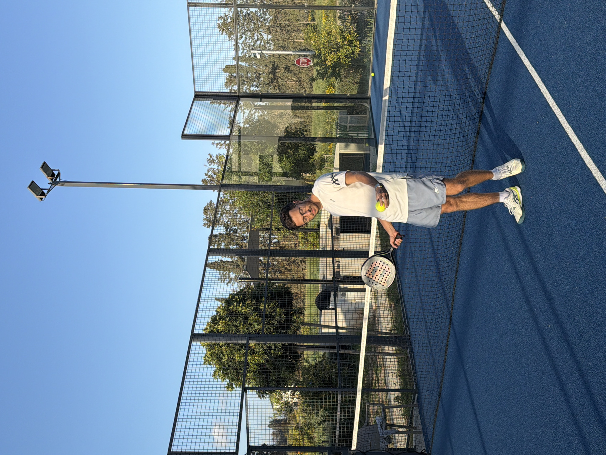 - "A man stands on a blue paddle tennis court, holding a paddle tennis racket in his right hand" by FM-B0rPs2, licensed under CC BY 4.0