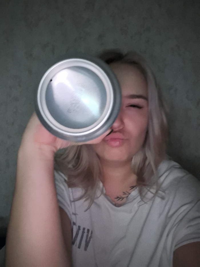 The image presents a close-up, indoor selfie of a female subject holding an aluminum beverage can