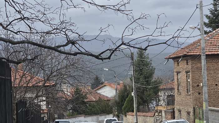 The image displays a residential street scene in Rozino, Bulgaria, under an overcast sky. A large, bare tree branch extends horizontally across the upper portion of the frame. In the midground, a two-story brick building with a red-tiled roof and two exposed metal downspouts is prominently featured on the right, directly behind a grey utility pole. This utility pole supports a white street lamp and multiple overhead electrical or communication wires that crisscross the scene. Residential buildings with red-tiled roofs are scattered throughout the midground, interspersed with numerous bare deciduous trees and some evergreen conifers. A street or roadway is visible in the lower center, with two partially visible white vehicles parked. In the background, layers of hills or mountains are discernible beneath the grey sky, with additional utility infrastructure visible in the distance. No people are present in the image.