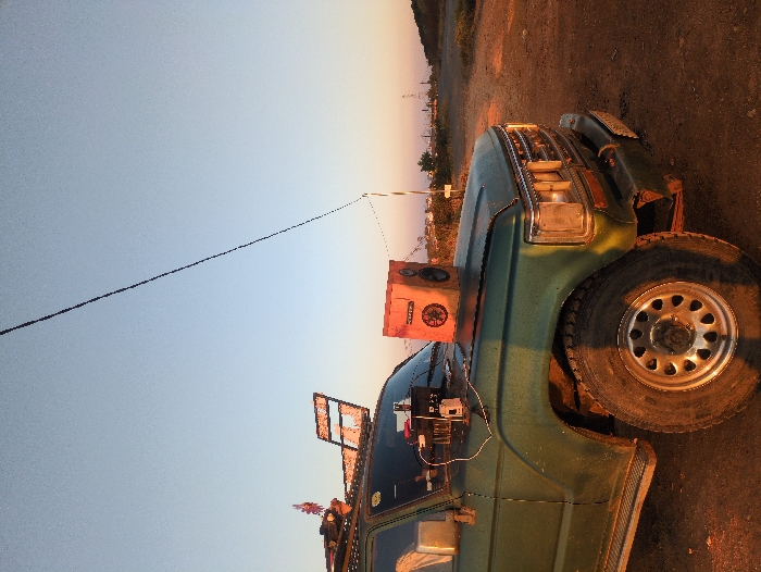 The image displays a dark green, rugged SUV, consistent with an older model Toyota Land Cruiser, parked on reddish-brown dirt in Trường Thọ, Vietnam. A rectangular wooden speaker box with two visible circular speaker cones is positioned on the passenger side of the vehicle's hood. On the driver's side of the hood, a black electronic device with white wiring and a small vertical antenna is present. The SUV features large, knobby off-road tires, a metallic front bumper, and a partially visible roof rack with a small, colorful pinwheel ornament on the roof near the windshield. The sky transitions from light blue at the top to a warm orange-yellow near the horizon, indicating low-angle sunlight, which casts an orange glow across the vehicle and ground. A thin, dark cable extends diagonally from the upper left to the mid-right of the frame. In the background, an unpaved road curves to the right, with distant vegetation, utility poles, and faint urban or industrial structures visible. No individuals are depicted.