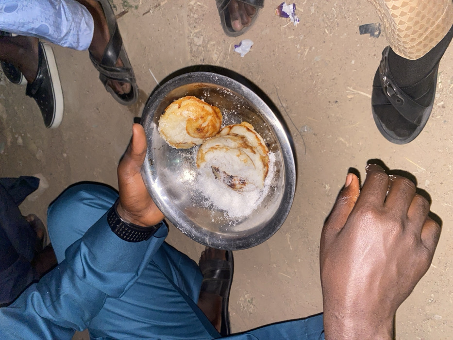 An overhead shot features a hand holding a small, silver plate containing three pancakes covered in sugar. The pancakes appear slightly browned. The person wearing a blue suit is seated on the ground surrounded by other people’s feet and footwear. A scattered piece of trash lies on the ground nearby. The ground appears to be dirt.