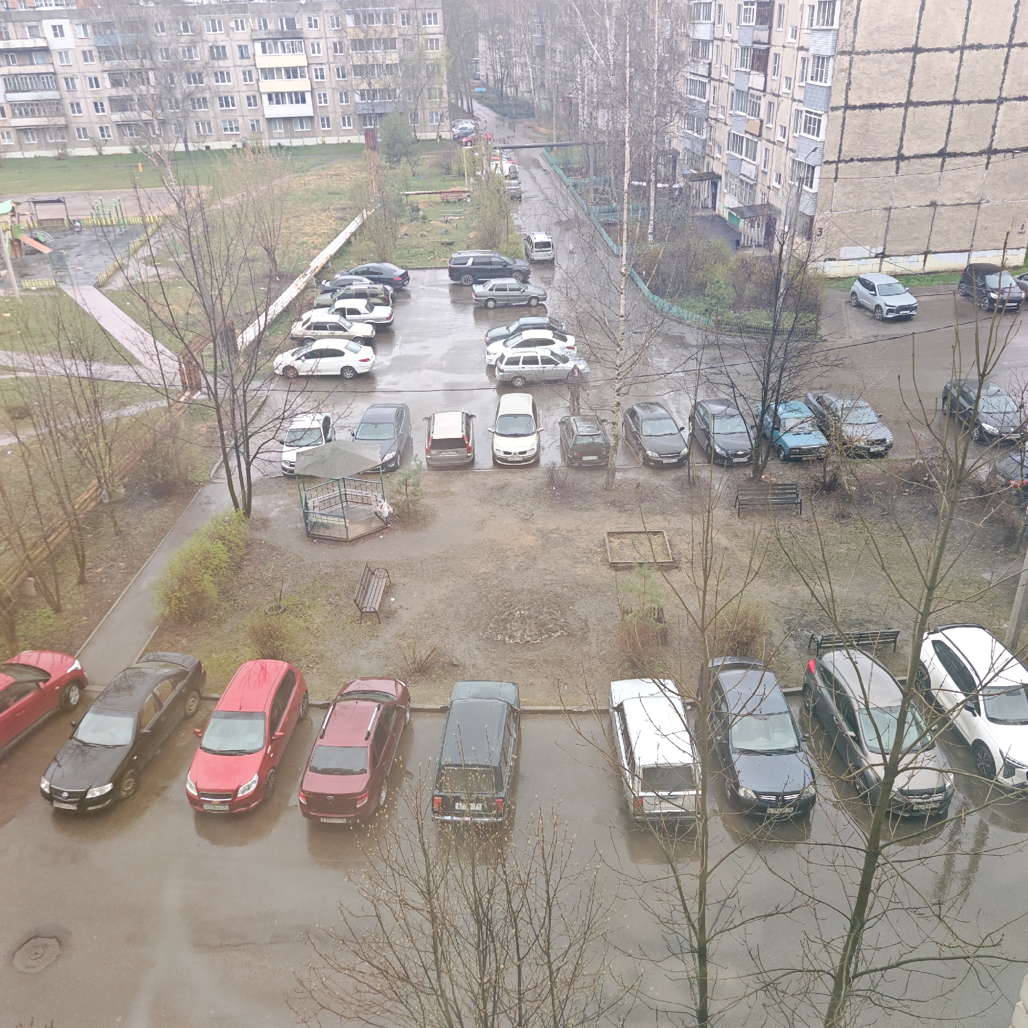 The image depicts an aerial view of a parking area in Rostov, Russia, on a rainy day. Multiple parked cars, of varying models and colors, are visible. The ground is wet, with puddles reflecting the overcast sky. Bare trees are scattered throughout the parking area. In the background are several apartment buildings. A playground can be seen to the left. No people are visible.