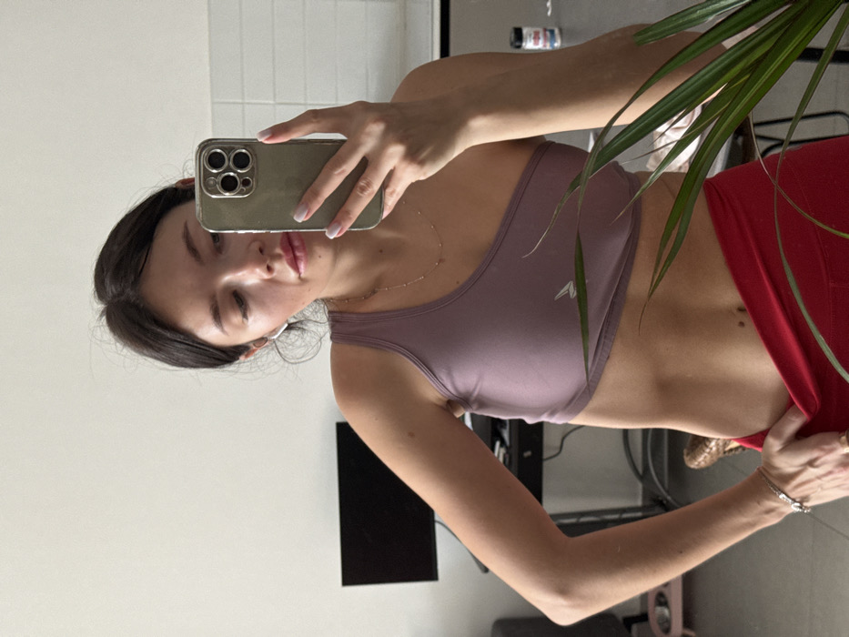 A female subject is depicted in a mirror selfie, taken indoors in a residential setting within Tel-Aviv, Israel. She appears to be an adult, with dark hair styled off the face and a fair complexion. Her left ear is fitted with a white wireless earbud. She is dressed in a one-shoulder mauve athletic top and red athletic pants. Adornments include a delicate chain necklace, a bracelet on her right wrist, and multiple rings on her right hand. Her fingernails feature a French manicure. The subject is holding a silver-toned smartphone, equipped with a triple-lens camera system and enclosed in a clear protective case, in her right hand to capture the reflection. Her left hand rests on her hip, subtly lowering the waistband of her pants. Her abdomen exhibits muscle definition, with two small piercings visible inferior to the navel. The reflected background features plain white walls. To the left, a dark flat-screen monitor rests atop a dark desk or credenza, with a portion of a grey upholstered furniture item partially visible further left. To the right, a light-colored countertop displays a dark bottle with a red and white label, alongside several white capsules or pills. White subway tiles form the backsplash behind the counter. A green plant with elongated leaves occupies the lower right foreground, partially obscuring the subject's right side and the reflected background.