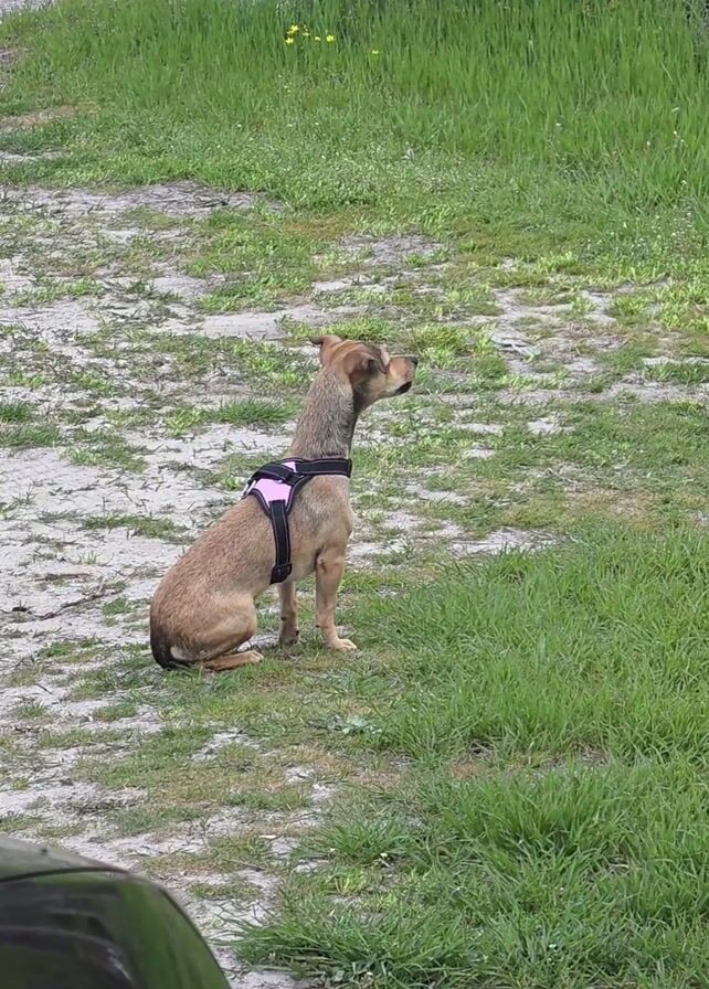 medium-sized dog sitting in a grassy and sandy area. The dog is primarily tan with darker patches around its head and a pink and black harness. The dog is facing to the right of the frame, looking off into the distance. The area around the dog is a mix of green grass and patches of sand and dirt, suggesting a yard or outdoor area. In the background, there's a fence and some greenery, possibly bushes or small trees. A small portion of what appears to be the interior of a car or vehicle is visible in the bottom left corner of the frame. The dog barks once during the video.