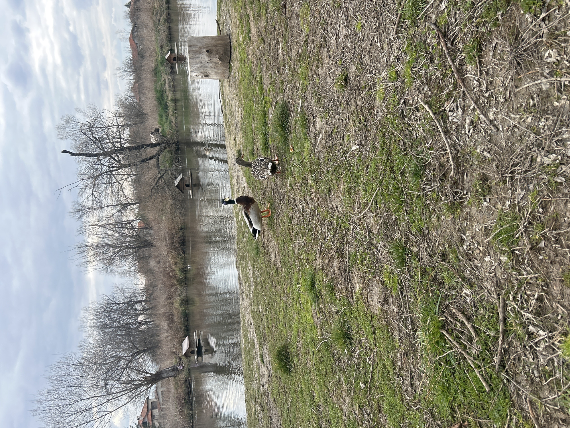 The scene depicts a natural setting by a body of water in Dolni Rakovets, Bulgaria, under an overcast sky. In the foreground, two ducks are positioned on a sparsely vegetated bank composed of green grass patches, bare dirt, and scattered dry twigs and leaves. A male Mallard, characterized by its green head and grey body, stands facing left. To its right, a female Mallard with mottled brown plumage walks away from the viewer, appearing to move towards the male; a small, light-colored object, consistent with a piece of bread, lies on the ground near her. On the far right of the foreground, a large, light-colored wooden tree stump stands upright. The midground features a calm body of water reflecting the sky and bare trees. Three wooden duck houses, each resembling a small cabin with a dark roof on a floating platform, are visible on the water. One is positioned on the left, another in the center, and a third partially obscured by the tree stump on the right. Additional ducks are visible swimming in the water near the far bank. The far bank is densely covered with dry grasses, reeds, and numerous bare deciduous trees and shrubs, indicating a late winter or early spring season. In the background, beyond the dense vegetation, several residential structures with reddish-brown tiled roofs are discernible through the trees on both the left and right sides. The sky overhead is heavily clouded with shades of grey, suggesting an overcast day. No human subjects are visible in the scene.