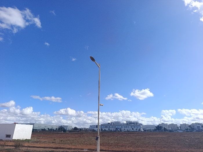 This image depicts an outdoor scene in Salé, Morocco, under a bright blue sky with scattered white cumulus clouds. The foreground consists of a large, flat expanse of reddish-brown, uncultivated earth with minimal dry vegetation. A tall, slender metal street light pole with a modern, dark-colored fixture at its apex stands prominently in the mid-ground, slightly right of center. A smaller, possibly secondary, light or sensor is affixed lower on the pole. To the far left, a portion of a white, angular, low-rise building or wall is visible. The background features a distant urban or industrial landscape: on the left, a long, light-colored industrial-style building with a flat roof is present, while to the right, a cluster of multi-story, modern residential or commercial buildings with numerous windows and flat roofs line the horizon. Several vehicles are discernible near these buildings on the far right. No individuals or active interactions are observed in the scene.
