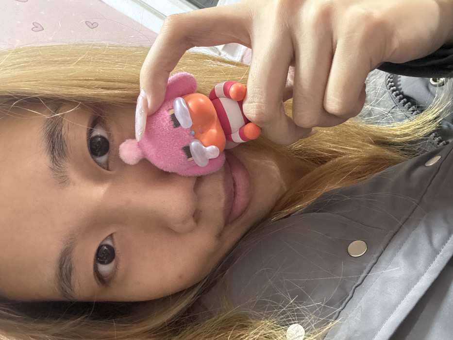 An indoor, chest-up photograph captured in Shapingba District, China, features a female individual with long, light brown hair. She is wearing a grey jacket with visible metallic snap buttons. Her left hand holds a small, pink and orange character figurine, positioning it directly in front of her face and partially obscuring her left eye. The figurine has a fuzzy pink head with a small pom-pom, an orange face with a blue nose, and prominent white tear-like streaks beneath its eyes. Its body is orange with horizontal white stripes. The individual's fingernails on her holding hand are manicured with a pale, shimmery polish. The background is a softly blurred indoor setting, revealing a light-colored wall adorned with faint pink heart outlines in the upper right quadrant.
