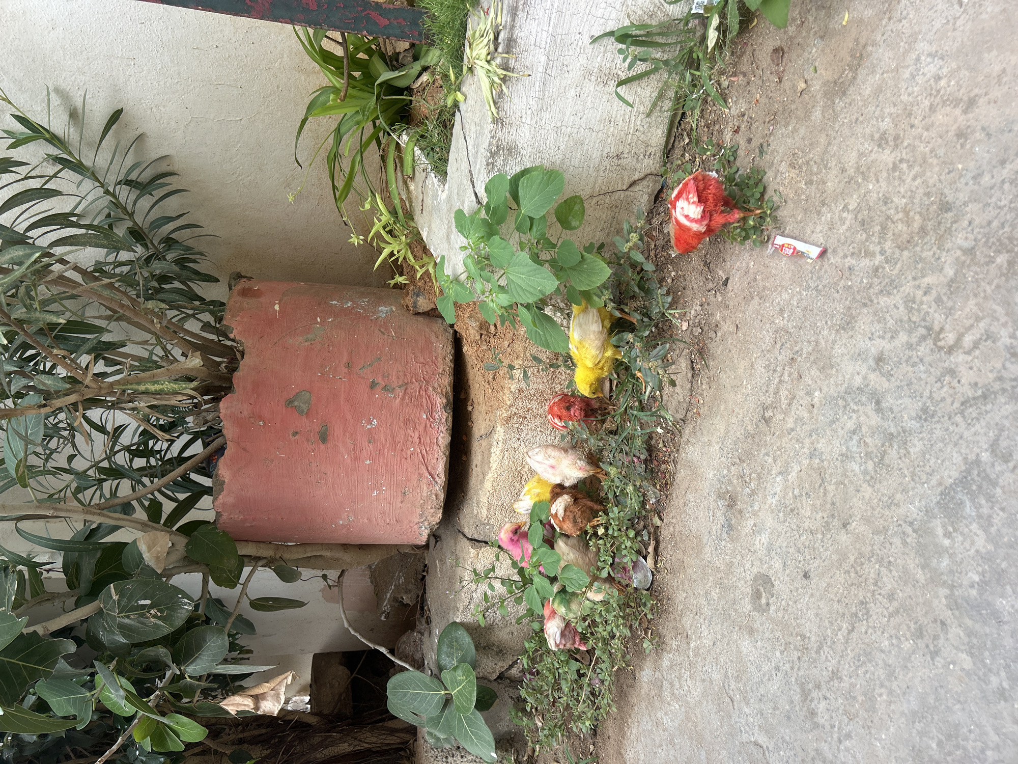 The image displays an outdoor scene in Puttaparthi, India, at ground level. Approximately eight to nine young chicks, exhibiting varied colorations including pink, yellow, red, and white with brown markings, are observed. The majority of the chicks are clustered in the mid-ground, actively pecking at the soil among small green plants and ground cover situated behind a light grey, cracked concrete curb. One red chick with white markings is positioned slightly forward on the immediate concrete ground. In the upper left, a large, weathered reddish-orange concrete planter contains a substantial leafy green plant. Further background elements include additional green foliage and a plain, light-colored (off-white) wall. The foreground consists of a textured grey concrete surface. A small, white and red plastic wrapper lies on the concrete near the isolated red chick. The environment appears to be an urban or semi-urban outdoor space with a mix of cultivated and wild vegetation and concrete structures. No human figures are present.