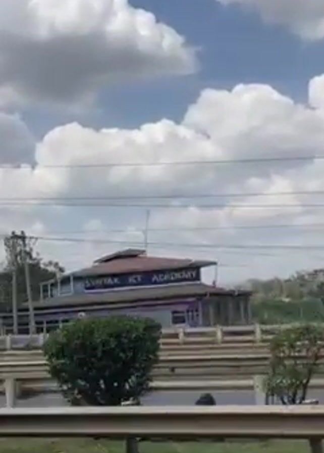 drive by Syntax ICT Academy. The academy is a two-story building with a brown roof, blue and purple exterior, and white trim. A large sign with the school's name is visible on the building. The view is from inside a car, looking out the window at the school as it passes by. Other vehicles can be seen on the road. Power lines and trees are also visible. The sky is blue with fluffy white clouds.