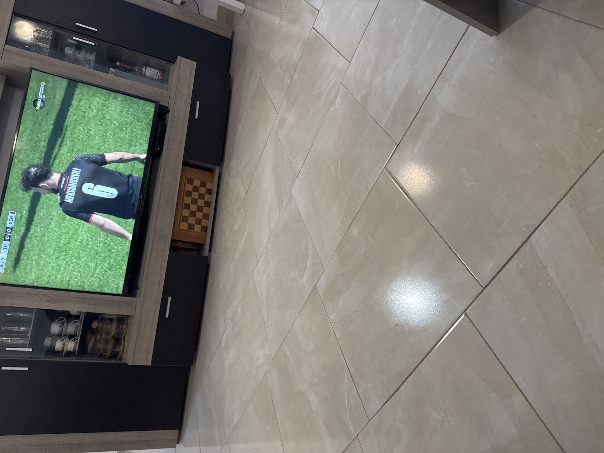 A medium shot indoors depicts a section of a room, dominated by a modern wall-mounted entertainment unit and a tiled floor. The entertainment unit is composed of dark brown and light gray panels, and it houses a television displaying a live soccer game. The game features a player wearing a black jersey with the number 6 and the name "MEKVIADISHVILI" visible on the back. Above and below the television are display shelves, filled with glassware and decorative items. To the right of the television, a chessboard is partially visible. The floor is covered with large, light-colored tiles, laid in a diagonal pattern, reflecting light and showing subtle variations in color and texture. No people are visible in the image, and the location is unspecified but possibly Marchaevo, Bulgaria, given the context.