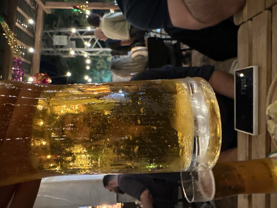 The image captures an outdoor or semi-outdoor bar setting at night in Be'er-Sheva, Israel. In the foreground, a large, chilled glass of golden-colored beer, exhibiting condensation and numerous bubbles, dominates the central view. To its lower left, a smaller glass of similar beer rests on a light-colored wooden table. Also on the table, a white smartphone with a dark screen and a small dish of light-colored snacks are partially visible. The midground features several blurred individuals: a bearded man in a dark shirt seated on the far left, and a person with light-brown hair seen from behind, seated towards the right. Other patrons are indistinctly visible further back. The environment includes string lights with round bulbs and colorful garlands (pink, yellow, green) strung across an overhead structure. A metal lattice structure and dimly lit green foliage are visible in the distance.