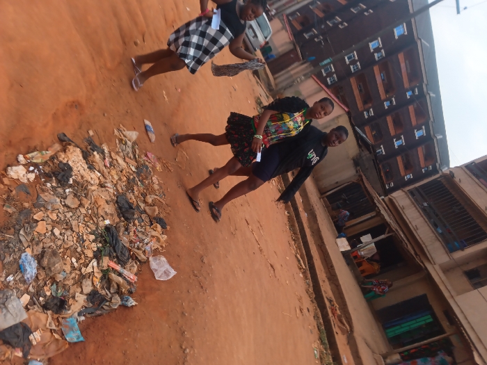 Three young women walking past a large pile of garbage. One woman wears a black and white checkered dress. Two women in the middle wear dark skirts. The last wears a black long-sleeved shirt. The ground is sandy, and a tall apartment building stands behind them.