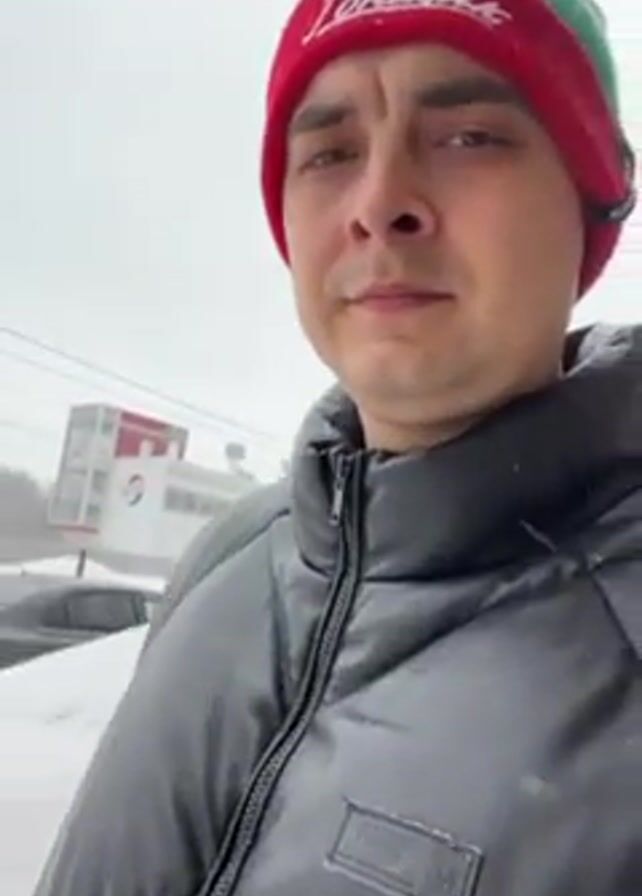 A man stands outside in the snow, looking directly at the camera. He wears a black puffy jacket and a red beanie with a green band. A building is visible in the background, along with a car parked in the snow.