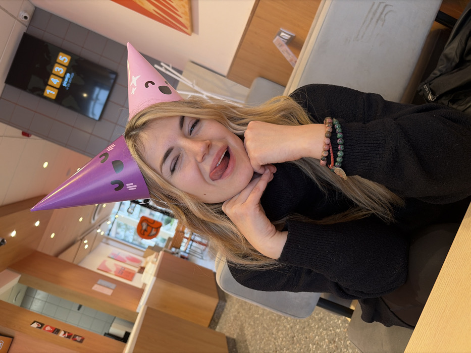 The image captures a female individual seated within Pizzerija 1435 in Podgorica, Montenegro. The subject, a blonde woman with long wavy hair, is positioned centrally and looking directly at the camera. She wears a black turtleneck sweater and two conical party hats: one purple with a cartoon face on her left, and one pink with stars on her right. Her facial expression includes a partially closed left eye, a slightly closed right eye, and her tongue extended from the right side of her mouth. Her hands are raised with fingers curled, positioned beneath her chin. On her right wrist, she wears multiple beaded bracelets, including one with green and red beads and a thin red cord bracelet with a small metallic charm. The environment indicates an indoor dining or cafe setting. Visible background elements include light wood paneling on walls and columns. The seating appears to be grey upholstered benches or chairs. A light wooden table surface is visible in the lower foreground. On a grid-patterned wall to the upper right, a large dark digital display shows "1435" in yellow digits, with "pizzerija" and "u podgorici" in smaller text beneath, set against a world map graphic. To the far left, through a glass facade, a blurred outdoor scene with foliage and an indistinct orange object is visible. An abstract orange-red artwork is partially visible on a wall to the right. The interior is brightly illuminated by overhead lighting.