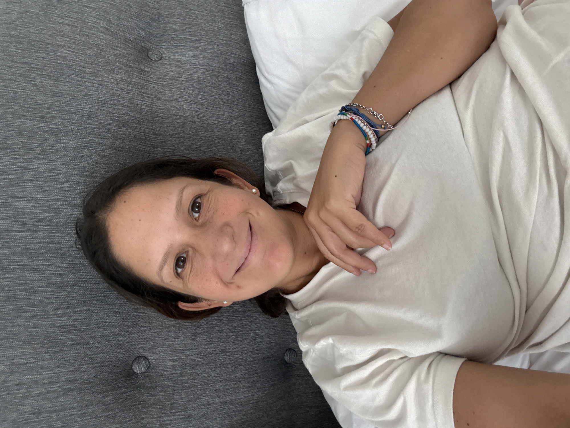 A woman is lying on a gray fabric-covered surface, presumably a couch or bed, with a white pillow under her head. She is wearing a white t-shirt and has several bracelets on her left wrist. She is smiling and looking at the camera. There is no information to determine the location to be San Isidro, Peru.