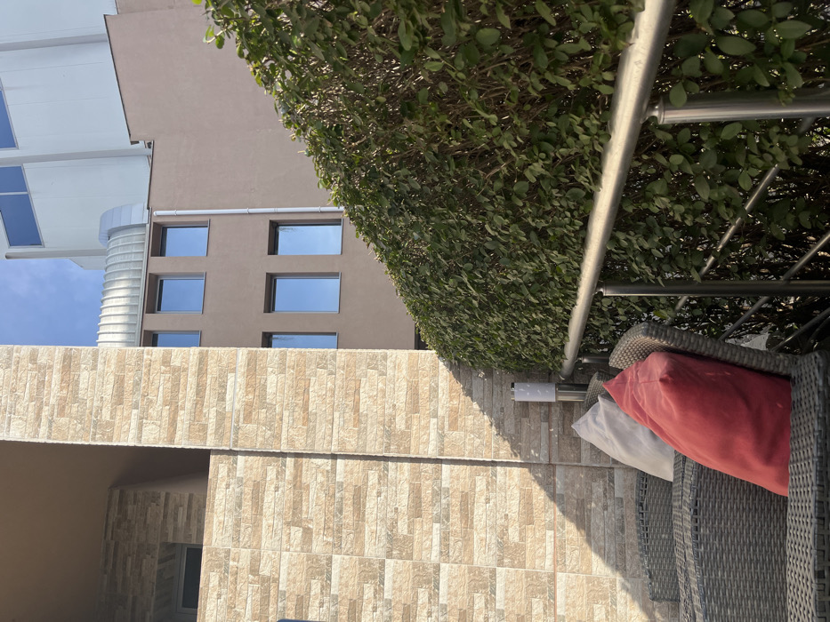 The scene, located in Popovo, Bulgaria, depicts an outdoor area featuring architectural structures, furniture, and landscaping elements under clear daylight. In the immediate foreground, to the lower left, are two dark grey wicker outdoor chairs, each equipped with one cushion: a red cushion on the front chair and a light grey cushion on the rear chair. A stainless steel cylindrical outdoor lamp stands partially visible behind the chairs. To the right, a dense green hedge forms a boundary, with a silver-colored metal railing running horizontally in front of it, supported by vertical posts. Behind the seating area, a building column or wall section, faced with light-toned rectangular stone-patterned tiles, is prominently positioned on the left. Direct sunlight illuminates the upper portion of this tiled surface, casting a sharp diagonal shadow across its lower half and the chairs. Further in the background, a multi-story building with a light brown facade is visible, featuring two rows of reflective rectangular windows that mirror the blue sky. A curved, corrugated metal ventilation duct is present on the roof of this brown building. Partially visible above and behind the brown building is a taller structure with a white or light grey facade. The sky in the upper portion of the image is clear blue. No individuals are present in the scene.