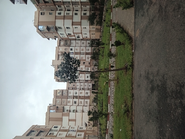 The image displays a residential complex located in Dar Bouazza, Morocco, under an overcast sky. Multiple multi-story apartment buildings with light brown and white facades, featuring numerous windows and balconies (some enclosed), surround a central landscaped courtyard. This courtyard contains manicured green grass, several small trees, and shrubs, bordered by low white and reddish-brown curbs. A paved walkway of light-colored pavers is visible on the right side of the green space. The immediate foreground consists of a dark asphalt surface. No individuals or vehicles are present in the observable scene.