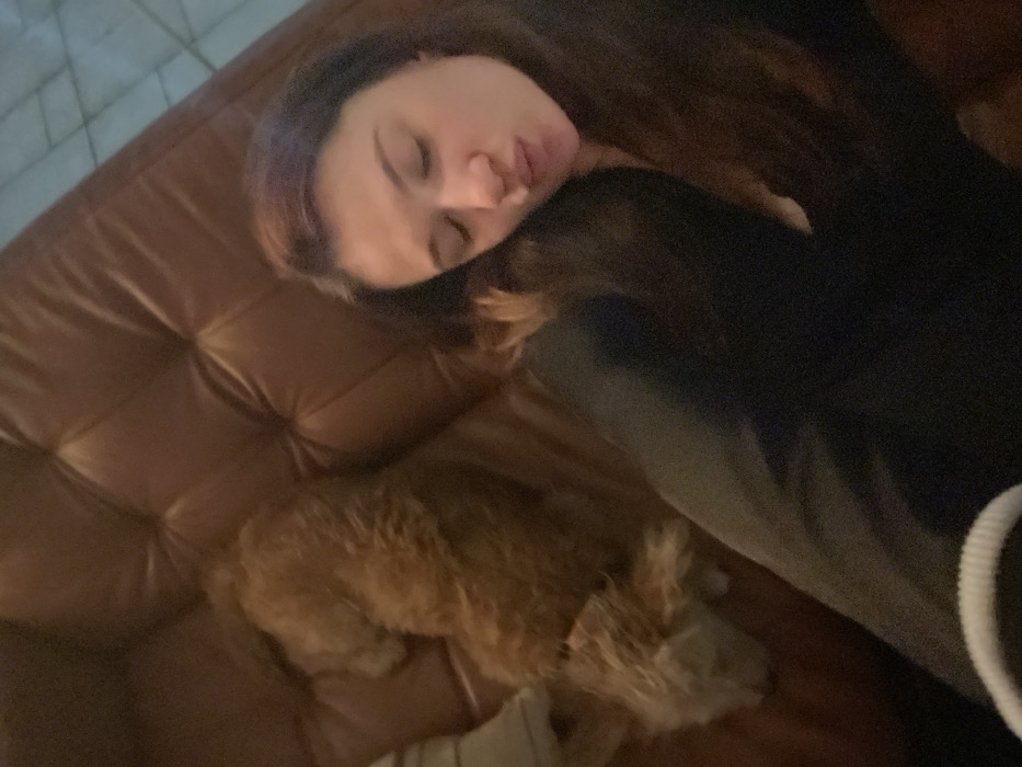 A woman is asleep on a brown leather couch, her face turned towards the viewer. She has long brown hair and is wearing a dark-colored shirt. A small brown dog is curled up near her feet, also asleep. Part of a white object is visible in the lower right corner of the frame. The lighting is dim.