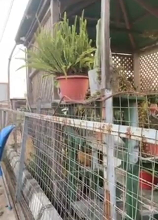potted fern placed on a metal fence. Behind the fence, there is a wooden gazebo with a green roof. The fence appears old and rusty, while the fern is green and healthy. The video seems to be taken outdoors, with a sky visible in the background.