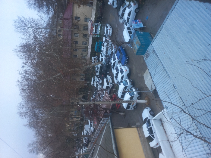 An elevated, wide-angle forensic view captures a busy urban parking lot and adjacent street in Fergana City, Uzbekistan, under an overcast sky during daylight hours. The visible foliage consists primarily of deciduous trees with bare branches, indicating late autumn or winter. The scene is densely populated with parked vehicles, predominantly white sedans and white Daewoo Damas-style minivans, alongside several darker vehicles including one blue sedan. In the background, a multi-story building with light-colored facades and a reddish roof is observed. To the left, a single-story building with a yellow exterior wall is partially visible. The foreground features a corrugated metal roof, partially obscured by tree branches. Within the parking area, a blue, weathered metal storage container or kiosk is present, adjacent to a blue freestanding sign. A small, striped-awning retail stall is located near the background building. The paved ground surface appears wet. No human figures are present.
