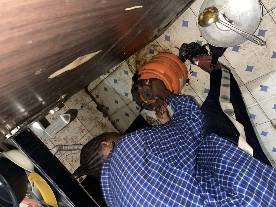 The image displays an indoor kitchen scene located in Muchiya, Nigeria