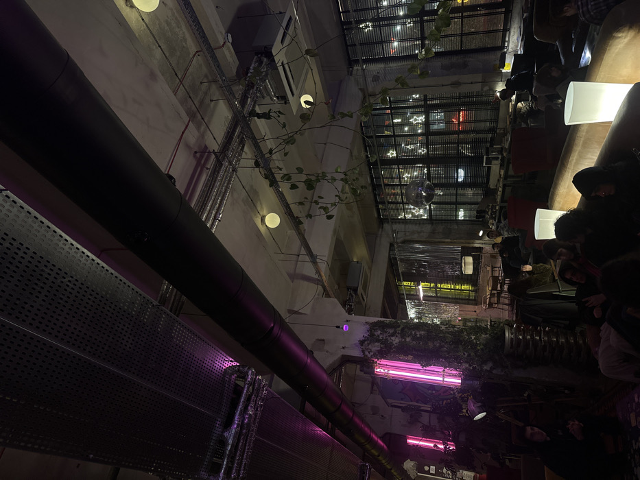 An indoor space with industrial-style ceilings features exposed pipes and ventilation systems, accentuated by purple and white lighting. Patrons are seated in the background, enjoying the venue's atmosphere, with a clear roof section allowing for a glimpse of the night sky. Green vines add a touch of nature to the otherwise structured environment.
