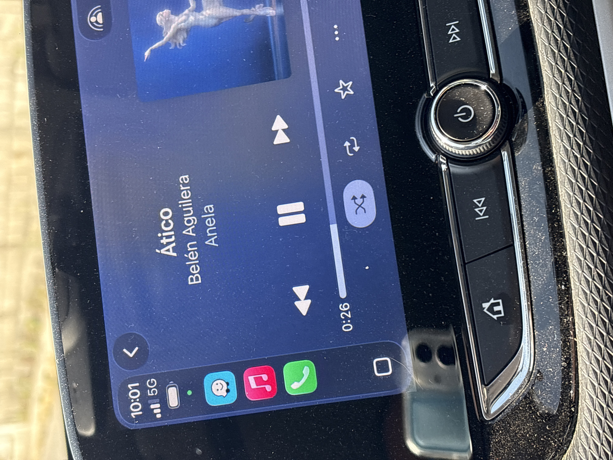 The image depicts the interior of a vehicle, specifically focusing on the infotainment system and part of the dashboard, located in San Juan Cuautlancingo, Mexico. The central subject is an active infotainment screen displaying a music player interface. In the upper left, the time "10:01" is visible, along with a "5G" network indicator showing three bars of signal strength and a nearly full battery icon with a green charging dot. A vertical sidebar on the left edge of the screen shows application icons for a messaging app (smiley face), a music app (red musical note), a phone app (green receiver), and an unidentified white square icon. The music player shows the song "Ático" by "Belén Aguilera" and "Anela." A progress bar indicates 0:26 seconds into the track, with playback controls for previous, pause, and next. Below these are icons for shuffle (highlighted in blue, indicating active), repeat, favorite (star), and a three-dot menu. The right side of the screen partially displays album art featuring a pale, ethereal figure with flowing hair against a dark blue background, appearing to be dancing or floating. A small profile/settings icon is visible in the top right corner of the screen. Below the touchscreen are physical car controls on a dark, reflective surface, which is notably dusty. These controls include a left-facing double arrow button, a "home" button (house icon), a central circular rotary knob with a power symbol, and a right-facing double arrow button. The rotary knob features a textured silver edge. Below these buttons, the dashboard exhibits a textured, cross-hatch pattern. The background outside the vehicle, visible above the screen, is out of focus and appears bright and sunlit, suggesting an outdoor environment. No people are visible in the frame.