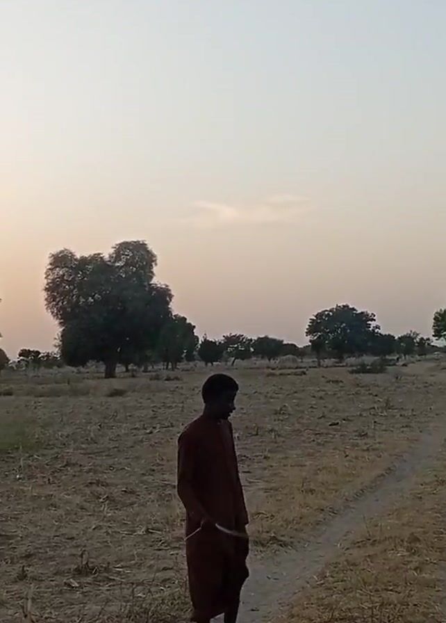 person standing in a dry field with trees scattered around. The person is wearing a reddish-brown robe-like garment and appears to be holding a stick. The field is mostly covered in dry grass and the sky is a light, faded color. The scene is likely taking place in a rural area during the early morning or late afternoon, given the lighting conditions. The camera moves slightly, panning across the landscape to show the field and trees from different angles.