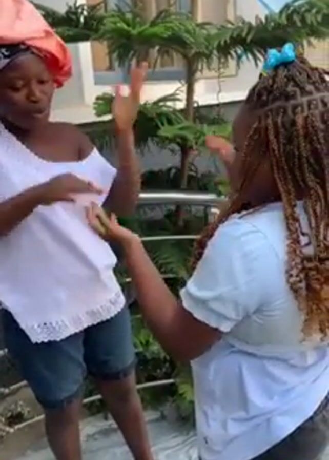 Two people stand on an outdoor patio, facing one another, and playing a hand-clapping game. The person on the left is wearing a white tank top, denim shorts, and a pink satin bonnet on their head. The other person is wearing a light blue t-shirt and dark shorts, and their hair is styled in light brown braids. They stand in front of a metal railing, with a house behind them and greenery visible behind the railing. A satellite dish is mounted on the house. The people are smiling and clapping their hands in a synchronized pattern.