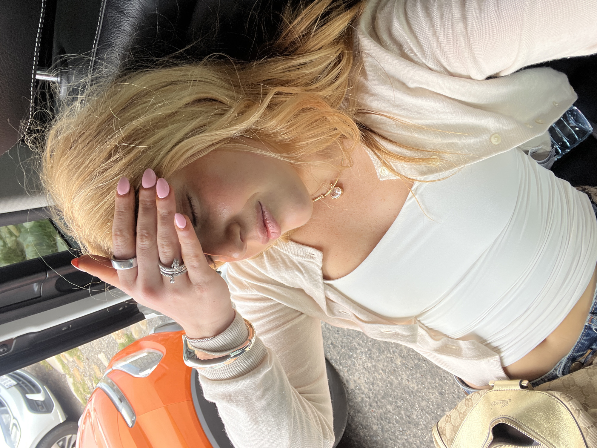 A person, appearing female with blonde hair, is seated in the passenger side of a vehicle