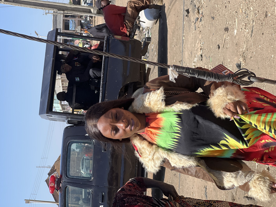 The scene is set in an outdoor, semi-urban environment in Bukuru, Nigeria, on what appears to be a sunny day. The foreground is dominated by a young adult female, positioned slightly off-center to the left. She has dark skin and long, straight dark hair. She wears a brown leather-look jacket with cream-colored faux fur trim on the collar and cuffs, over a multi-colored maxi-dress with a black top portion featuring green, yellow, and red patterns. Her expression appears somber, with her mouth slightly downturned. Her left hand is visible, holding a portion of her dress, and a chain-strap shoulder bag is visible on her right side. To her immediate left, partially visible, is another individual wearing a patterned garment. To the right of the central female figure, a thick, braided metal cable runs vertically through the frame. In the mid-ground, a dark-colored pickup truck with a caged bed is parked. A red siren light assembly is mounted on the roof of the cab. Inside the caged bed, at least two men are visible. One man, sitting on the left side of the bed, is partially obscured. Another man, wearing a dark uniform with insignia on the sleeve and a dark cap, is seated on the right side of the bed, looking generally towards the right. He appears to be a law enforcement officer. Further to the right and slightly behind the pickup truck, another man in a red shirt and brown trousers sits on what appears to be a makeshift bench or platform. The ground throughout the scene is a dusty, light-colored dirt surface with scattered debris. In the background, various buildings are visible, including one with a sign featuring the word "PHONES." Overhead, power lines are visible against a clear blue sky.